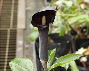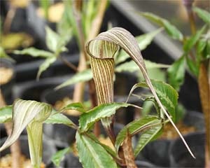 当園も即売品をたくさん持って行きます。草も木もいろいろです。ご希望の品物がありましたら、在庫があるものはお持ちいたしますのでご連絡下さい。ところでしたはツクシマムシグサです。