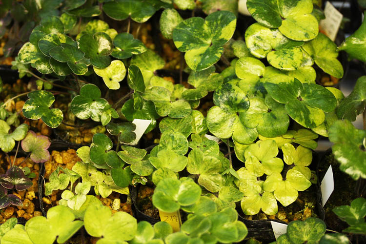 春になり色々な植物が芽吹いてきましたが、斑入植物もいろいろと出てきました。やはりヤマシャクヤクとトチバニンジンが人気です。あと雪割草の斑入も様々な種類があり、みていて飽きません。