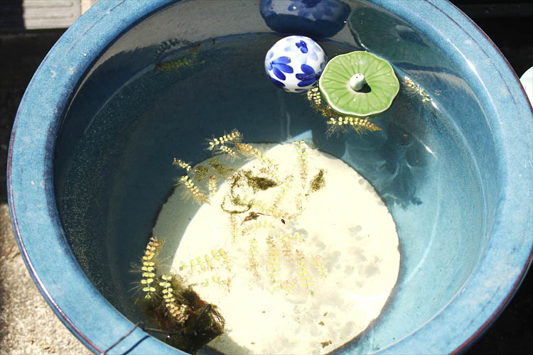 とりあえず水をいれて、水草を入れて、メダカの卵を2匹分ほどいれ、フと見たら既に稚魚が泳いでいた。注ぎたての水道水100%だけど大丈夫か・・・?そのあとしばらくして見たら元気に泳いでいたので、水道水の影響はなさそうでした。しかしさらに稚魚を4匹も発見。全然気づきませんでしたが、卵も稚魚も大変小さいのでいつの間にか5匹も水草と一緒に連れたんでしょうね。ということは水槽内にはもう結構たくさん、ひょっとして保育園は必要ない?まあ、今年は数が少ない気がするのでしばらく保育園は継続します。