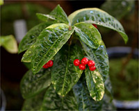 別名「百両金」とも呼ばれ江戸時代より鑑賞されてきたカラタチバナ。幅広い葉の変化があり、よくこんな葉姿になったものだと感心します。