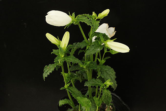 イシダテホタルブクロの白花種です。花色はきれいな白で、小型でランナーをよく出す性質はイシダテホタルブクロそのものです。