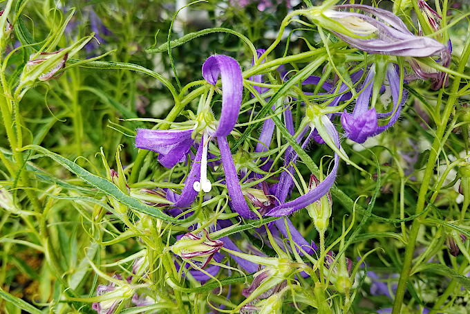 海外で交配されたホタルブクロ、Campanula ‘Sarastro’ 。Campanula takesimanaと他の品種の交雑から生まれた、鮮やかな濃紫色が美しいすぐれた品種です。暑さにも耐え、盛夏に群生している姿はとてもきれいです。