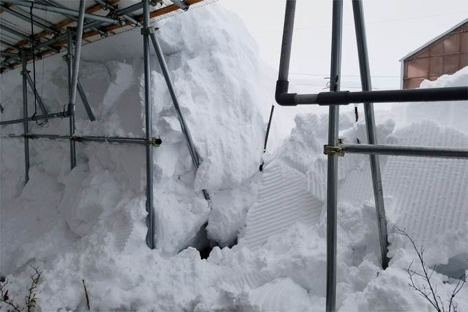 積もった雪の上に水が降り、それが凍って氷筍化。