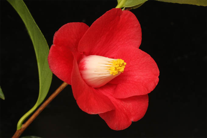 一見すると、王冠という肥後椿を思わせる。でもこれは炉開きです。花にウィルス性の白斑模様が入り独特な美しい花になりました。これが固定すればラッキー。
